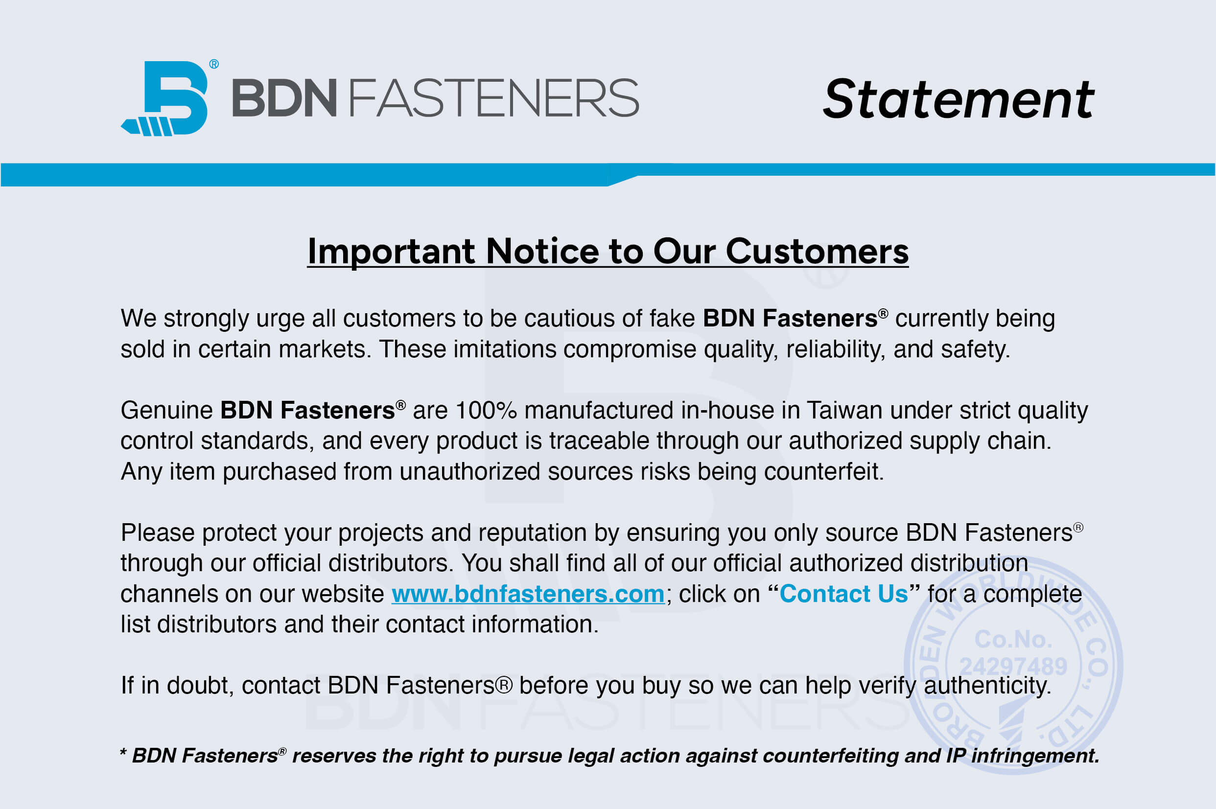 Please protect your projects and reputation by ensuring you only source BDN Fasteners® through our official distributors. You shall find all of our official authorized distribution channels on our website www.bdnfasteners.com; click on “Contact Us” for a complete list distributors and their contact information.